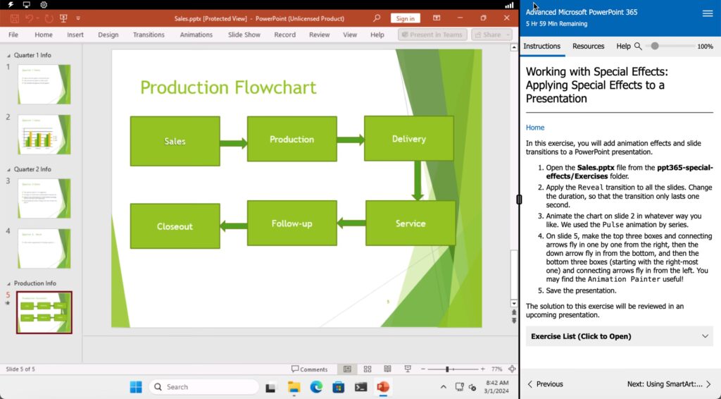 Work with media. Build advanced transitions and animations. Collaborate on a presentation. Customize the delivery of a presentation. Modify presentation navigation. Secure and distribute a presentation. Students should have attended or be familiar with the concepts presented in the Microsoft PowerPoint Introduction Training course.