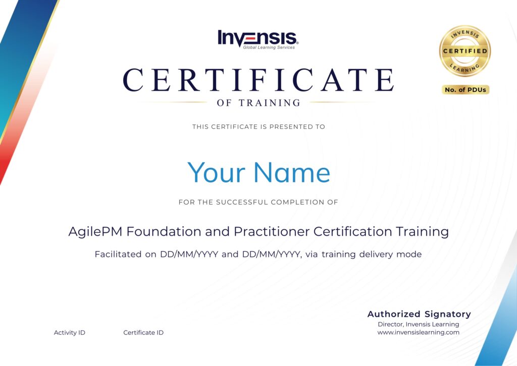 La finalizarea cu succes a examenului Foundation, vei primi certificatul tău AgilePM Foundation. Un beneficiu suplimentar al certificării AgilePM v3 Foundation este că vei primi și o insignă Business Agility Professional Level 1, emisă de Agile Business Consortium, recunoscând înțelegerea ta a agilității la nivel de bază în afaceri.