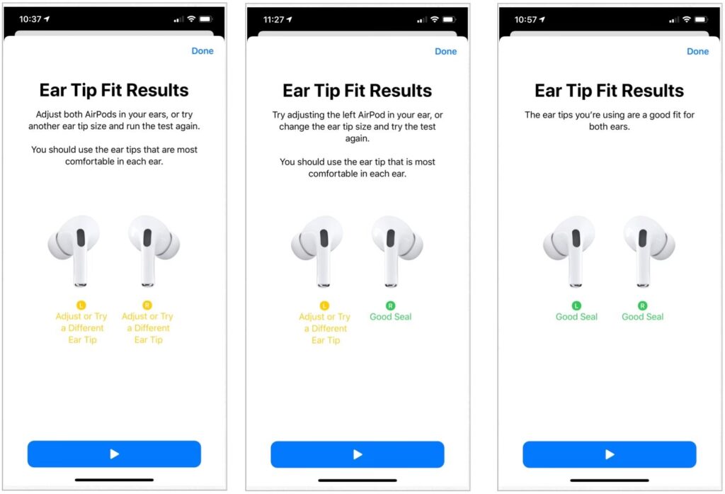 Acest instrument, disponibil pe iPhone sau iPad, este conceput pentru a te ajuta să verifici dacă vârfurile auriculare pe care le folosești asigură o etanșare optimă pentru fiecare cască, esențială pentru anularea zgomotului și calitatea audio.