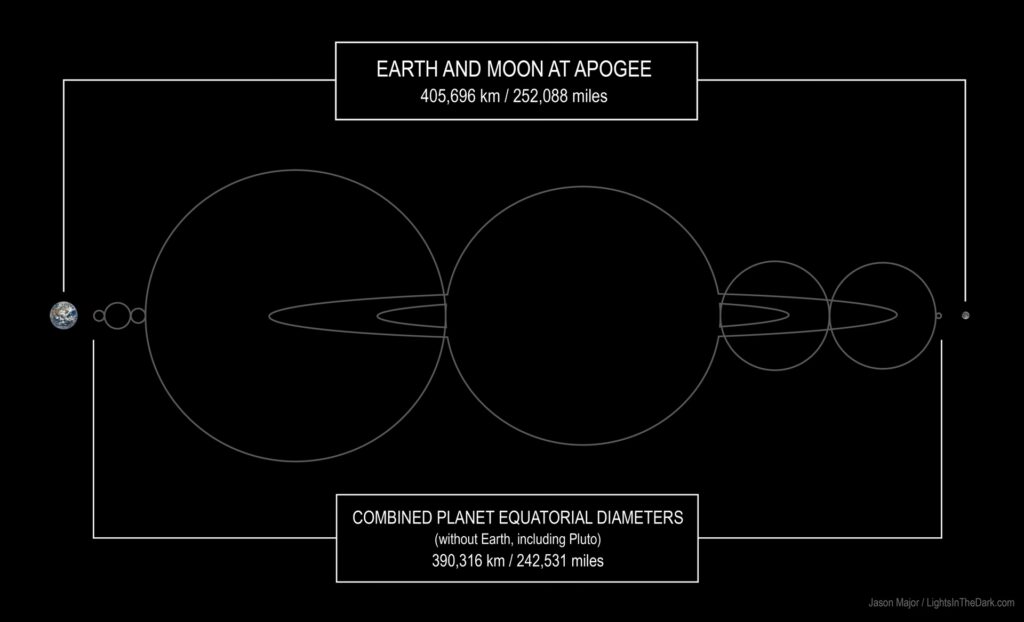 - Însă, la apogeu (când Luna este cel mai departe de Pământ), distanța suprafață-suprafață ajunge la aproximativ 396.898 km. În acest caz, suma diametrelor planetelor (380.012 km) este mai mică decât spațiul disponibil. Astfel, este absolut posibil să aliniem toate cele șapte planete (Mercur, Venus, Marte, Jupiter, Saturn, Uranus și Neptun) între Pământ și Lună, cu un spațiu considerabil rămas liber. De fapt, conform ilustrațiilor și calculelor detaliate, toate cele șapte planete – Mercur, Venus, Marte, Jupiter, Saturn, Uranus și Neptun – ar încăpea perfect în acest spațiu, cu aproximativ 8.030 km (sau 4.990 mile) rămași liberi. Aceasta demonstrează o dată în plus cât de vast este, de fapt, spațiul, chiar și la scara aparent mică a distanței Pământ-Lună.
