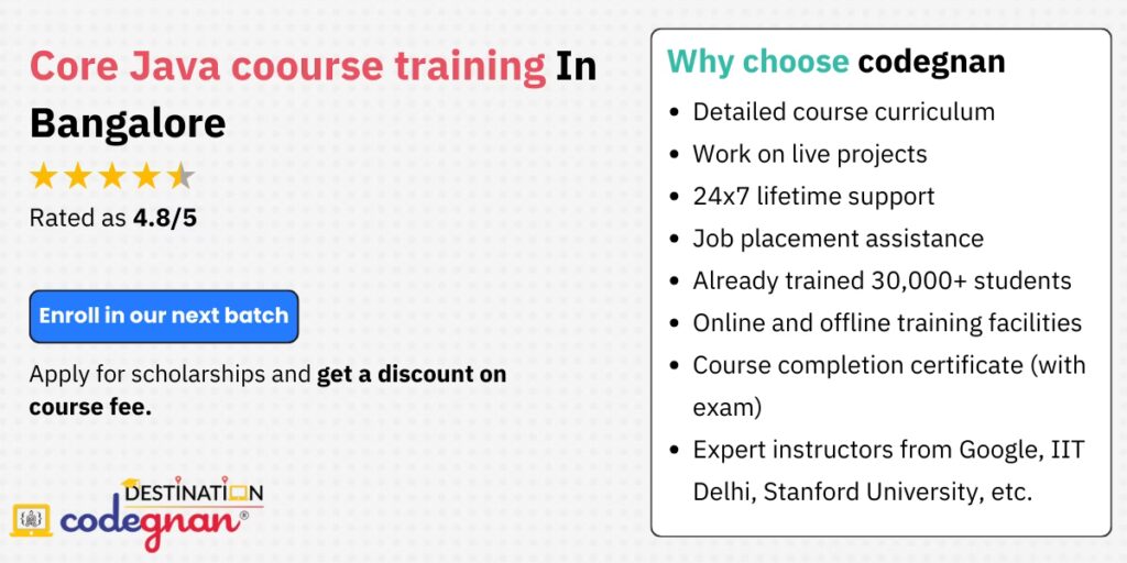 Dacă ești un proaspăt absolvent în căutare de cursuri Java în Bangalore cu pregătire pentru plasament, sau un profesionist care dorește să-și avanseze cunoștințele Java/J2EE, Besant Technologies este destinația perfectă. Punând capăt căutărilor tale pe Google pentru „Java training near me” sau „Java Training in Bangalore”, te invităm să te înscrii la o clasă demo și să-ți îndeplinești visul de a urma o carieră în dezvoltarea Java/J2EE.