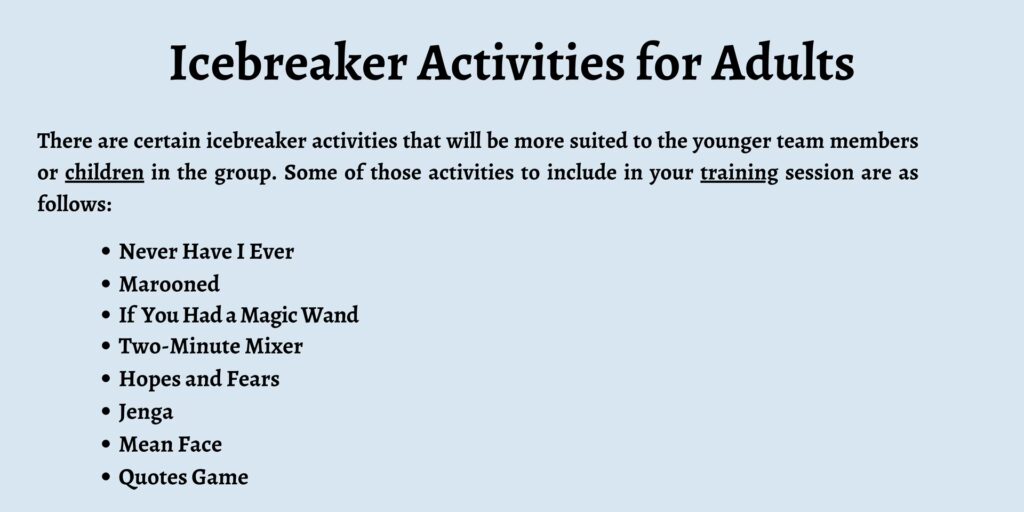 Icebreaker-ele sunt activități scurte, concepute pentru a încălzi și a angaja un grup la începutul unei sesiuni, unui antrenament sau unei întâlniri. Scopul lor principal este de a realiza unul (sau mai multe) dintre următoarele: