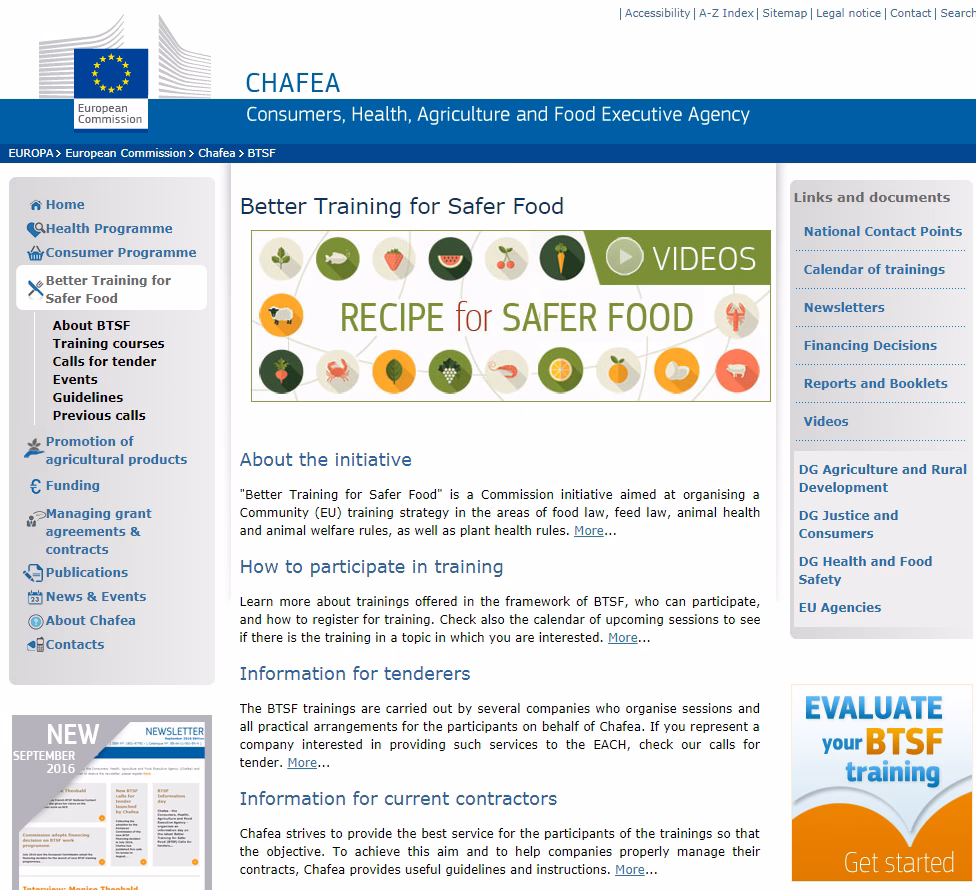 - Inițiativa Better Training for Safer Food (BTSF): BTSF este o inițiativă crucială care oferă formare personalului din statele membre ale UE și din țările terțe în domeniile siguranței alimentare, sănătății animale, sănătății plantelor și bunăstării animalelor. Scopul este de a asigura o aplicare uniformă și eficientă a legislației UE în aceste domenii. Prin BTSF, Chafea contribuie direct la menținerea unor standarde înalte de siguranță alimentară pe întreg teritoriul Uniunii, protejând sănătatea publică și încrederea consumatorilor în produsele alimentare. Această inițiativă este fundamentală pentru prevenirea crizelor alimentare și pentru asigurarea trasabilității și calității produselor alimentare.