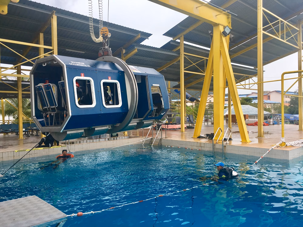 - Evacuarea cu Elicopterul Subacvatic (HUET) și Scăparea de Urgență Aeriene (CA-EBS): Acesta este unul dintre cele mai intense și practice module. Participanții sunt instruiți și exersează tehnicile de supraviețuire în cazul unui accident de elicopter deasupra apei, inclusiv ieșirea dintr-o cabină scufundată și răsturnată. Se învață utilizarea echipamentelor de respirație de urgență cu aer comprimat (CA-EBS).