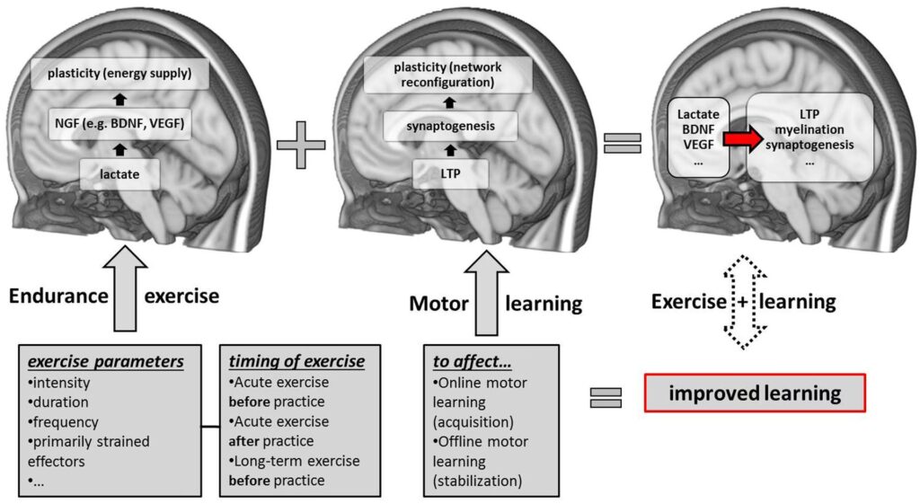 Antrenamentele aerobice, cum ar fi alergatul, înotul, ciclismul sau mersul rapid, sunt cele mai studiate în contextul sănătății cerebrale. Impactul lor pozitiv asupra creierului este în mare parte mediat de o creștere a expresiei anumitor proteine și factori de creștere. Printre aceștia, factorul neurotrofic derivat din creier (BDNF) este de o importanță crucială. BDNF este adesea denumit "îngrășământul creierului" deoarece susține creșterea, diferențierea și supraviețuirea neuronilor existenți și promovează formarea de noi neuroni și sinapse, un proces numit neurogeneză. Exercițiile aerobice stimulează producția de BDNF, în special în hipocampus, o zonă a creierului vitală pentru învățare și memorie. Pe lângă BDNF, exercițiile aerobice influențează și alți factori: lactatul, un produs al metabolismului energetic, despre care s-a demonstrat că poate servi drept combustibil pentru neuroni și poate modula expresia genelor legate de plasticitatea sinaptică; factorul de creștere endotelial vascular (VEGF), care promovează formarea de noi vase de sânge (angiogeneza) în creier, îmbunătățind astfel aportul de oxigen și nutrienți; și alte proteine care contribuie la sănătatea neuronală și la rezistența la stres.