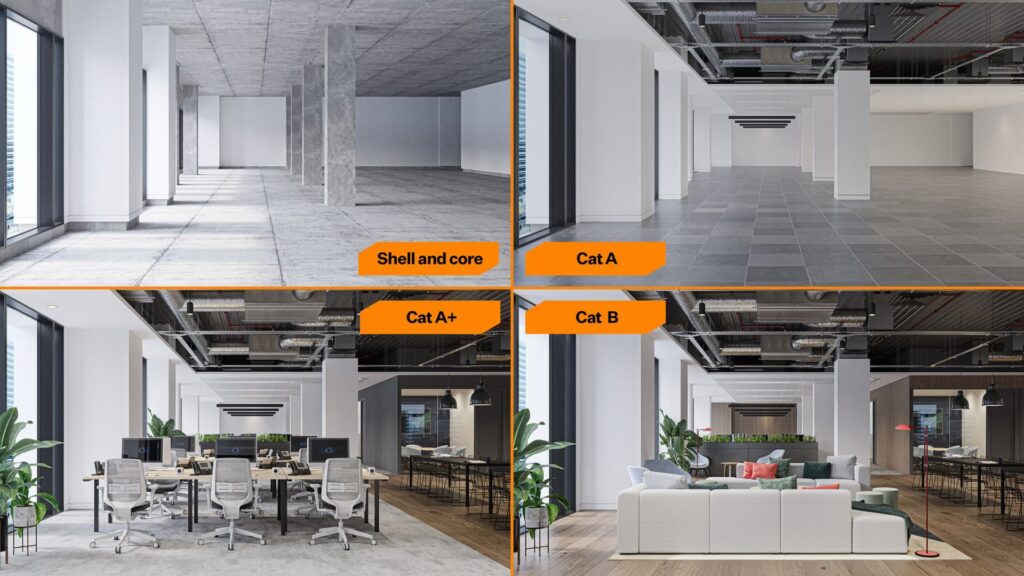 Pe scurt, Categoria A transformă un spațiu gol într-unul brut, dar funcțional, pregătit pentru a fi personalizat de chiriaș. Nu este un spațiu în care angajații se pot muta imediat și începe lucrul.