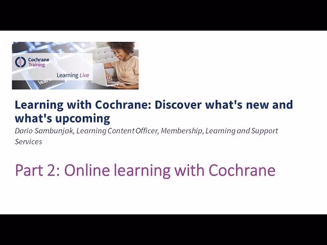 Cochrane Learning Live este o serie de webinarii lunare, multe dintre ele acoperind aspecte metodologice legate de cercetare. Acestea oferă conținut valoros pentru cercetători la toate etapele carierei, având și o arhivă extinsă de sesiuni anterioare și oportunitatea de a deveni prezentator.