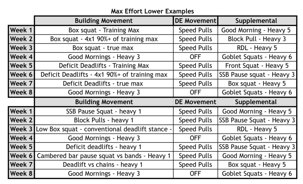 Această zi alternează săptămânal între o variație de genuflexiuni și una de îndreptări, vizând 1RM. Un ciclu de 12 săptămâni oferă o varietate excelentă: