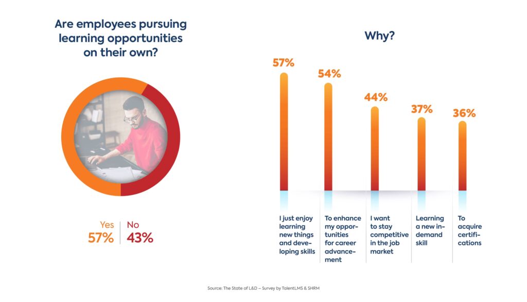 O statistică surprinzătoare de la Forbes indică faptul că 59% dintre angajați declară că nu au avut niciodată parte de formare la locul de muncă, abilitățile lor fiind în întregime autodidacte. Această situație este deosebit de comună în rândul talentelor din tehnologie. O mare provocare, citată de aproape jumătate (49%) dintre angajați, este lipsa timpului, care îi împiedică să se angajeze în inițiative de învățare și dezvoltare.