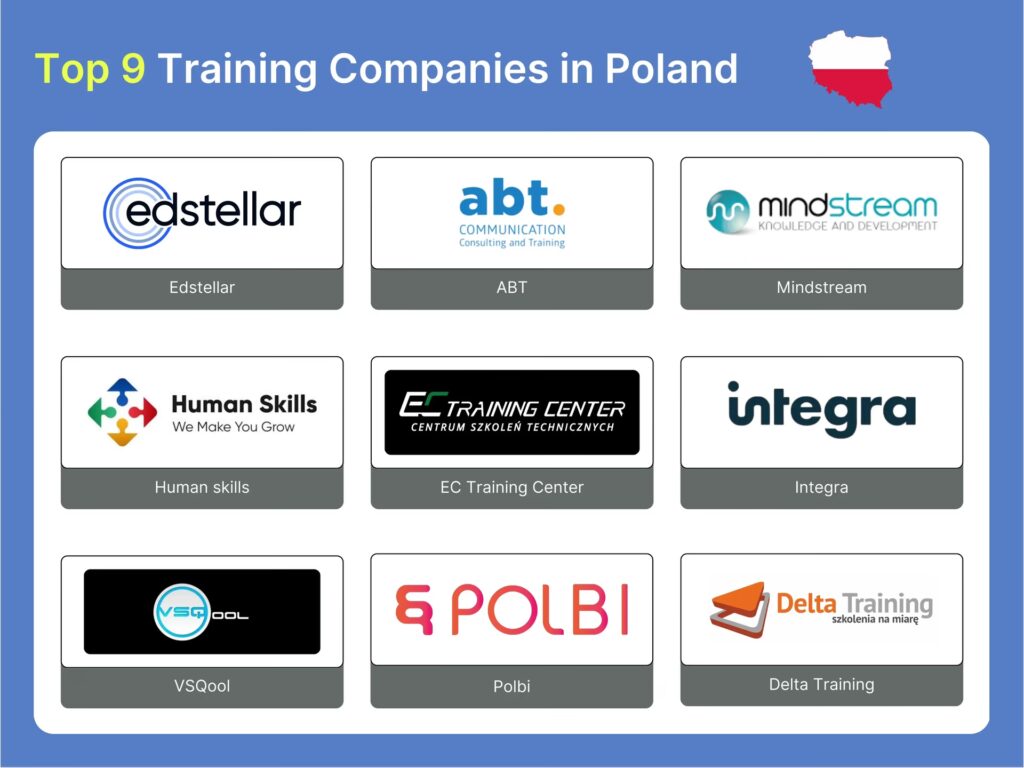 Polonia găzduiește o serie de companii de pregătire corporativă de elită, dedicate dotării organizațiilor și profesioniștilor cu abilități și cunoștințe esențiale. Aceste companii de prestigiu oferă o gamă largă de programe, inclusiv pregătire tehnică, dezvoltarea leadership-ului și îmbunătățirea abilităților soft. Dedicarea lor față de excelență influențează semnificativ mediul corporativ din Polonia și își extinde impactul la nivel global. Iată o prezentare a unora dintre cele mai influente: