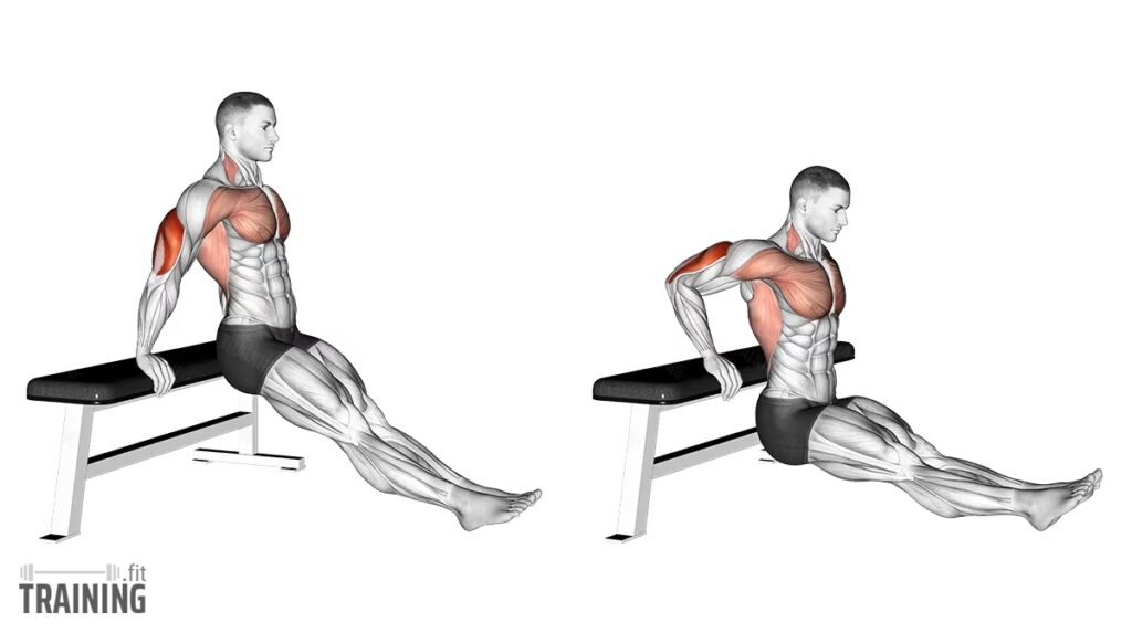 - Bench Dips (Dips la Bancă sau Scaun): O alternativă excelentă pentru antrenamentele acasă sau pentru cei cu forță limitată. Acest exercițiu pune mai puțină greutate pe brațe.