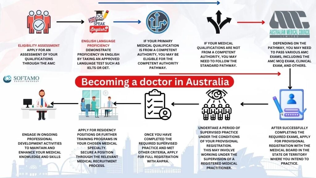 Odată ce calificările sunt recunoscute, medicii, fie ei absolvenți ai universităților australiene sau internaționali, parcurg o serie de etape de pregătire postuniversitară. Aceste etape sunt concepute pentru a consolida cunoștințele, a dezvolta abilitățile clinice și a pregăti medicul pentru practica independentă și specializare.