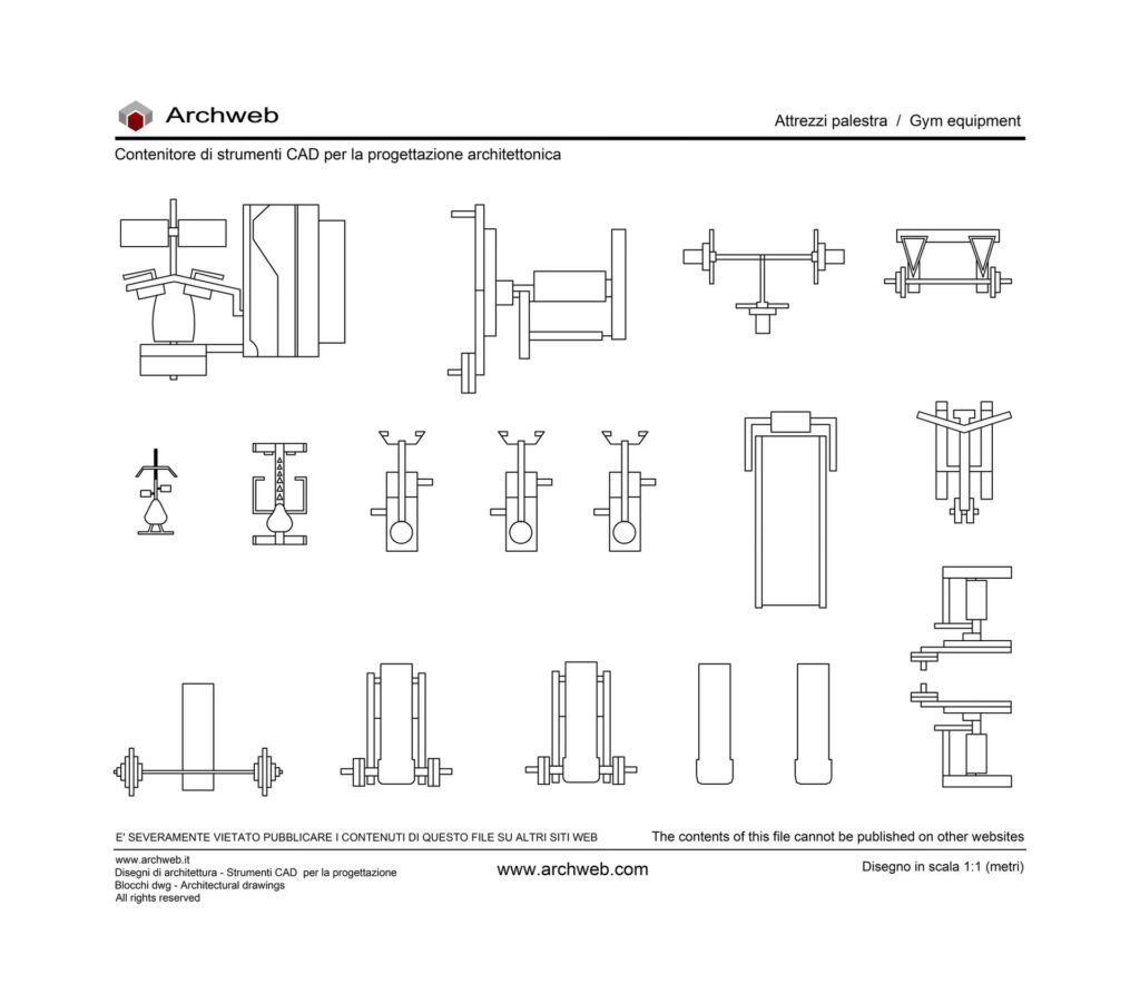 O sursă excelentă de blocuri CAD gratuite pentru echipamente fitness este dwgmodels.com, ale căror resurse sunt adesea partajate și prin platforme precum First In Architecture. Aceste site-uri oferă o selecție amplă de blocuri de înaltă calitate, pregătite pentru a fi integrate în proiectele tale.
