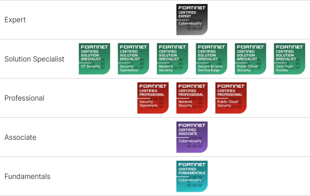 Fortinet oferă un program de certificare structurat pe mai multe niveluri, conceput pentru a valida diferite grade de expertiză, de la cunoștințe fundamentale la expertiză avansată în designul și depanarea rețelelor complexe. Aceste certificări sunt recunoscute la nivel industrial și demonstrează capacitatea unui profesionist de a lucra cu produsele și soluțiile Fortinet. Iată o prezentare detaliată a nivelurilor de certificare: