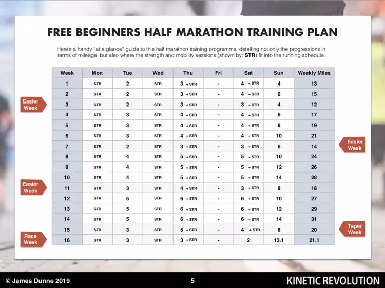 Sfat: În ultimele două săptămâni de antrenament (săptămânile 6 și 7), evită antrenamentul de forță intens pentru a te asigura că ești complet odihnit și pregătit înainte de startul semimaratonului.