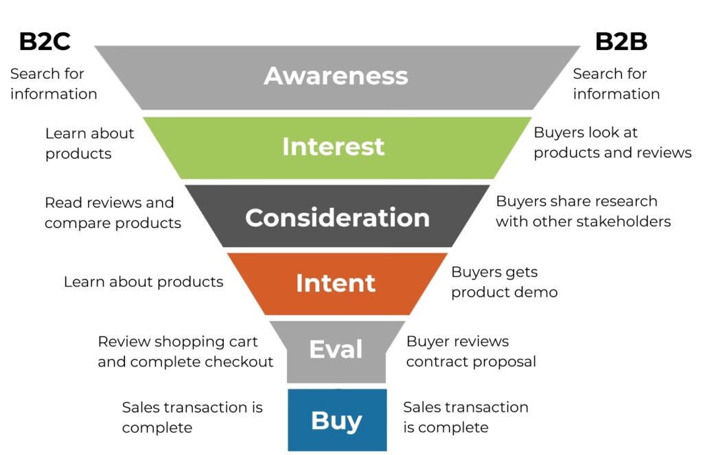Deși pot exista variații în denumiri, majoritatea pâlniilor de vânzări respectă modelul AIDA (Awareness, Interest, Desire, Action):
