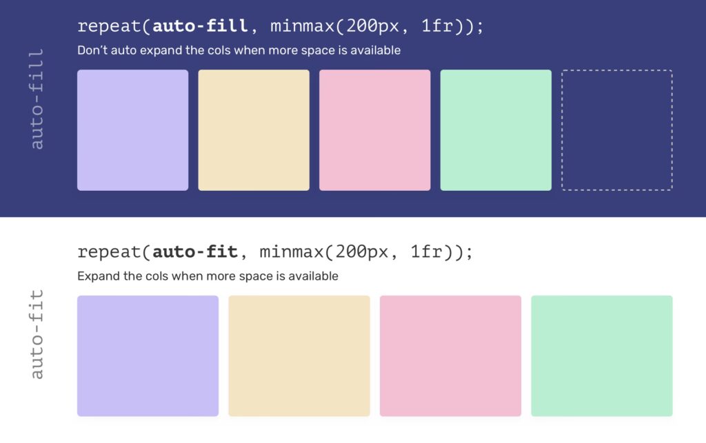 De exemplu, grid-template-columns: repeat(auto-fill, minmax(200px, 1fr)); va crea coloane de cel puțin 200px lățime. Dacă spațiul disponibil permite, vor fi create mai multe coloane, chiar dacă nu toate sunt umplute cu conținut. Acest lucru poate duce la un spațiu gol distribuit uniform, în cazul în care numărul de elemente este mai mic decât numărul maxim de coloane care ar putea încăpea.