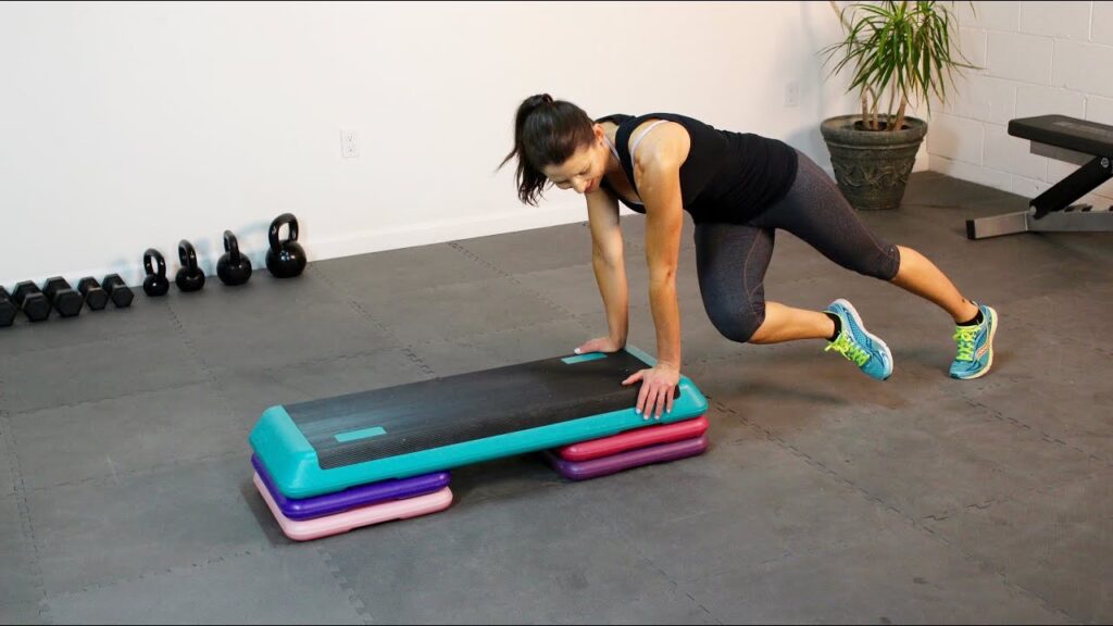 - Traveling Push-Up: Începe într-o poziție de flotare lângă step, cu o mână pe platformă și o mână pe podea. Îndoaie coatele și coboară pieptul spre podea, apoi revino la poziția de start și mișcă-ți brațele și picioarele lateral, deplasându-te deasupra step-ului pe cealaltă parte. Lasă o mână pe step și așează o mână pe podea și fă o altă flotare. Continuă, alternând părțile.