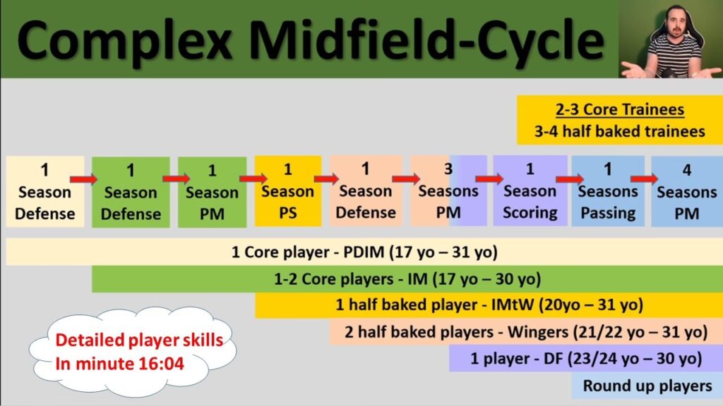 - 5 mijlocași centrali care joacă cele 90 de minute în poziția lor (de exemplu, 3 în meciul de ligă și 2 în amical). Aceștia vor primi antrenament complet de playmaking.