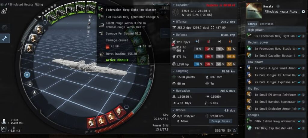 - Daune Extreme: Cu acest fit, Hecate poate atinge un DPS amețitor, capabil să topească fregate, crucișătoare și chiar să pună presiune pe luptătorii transportoarelor.
