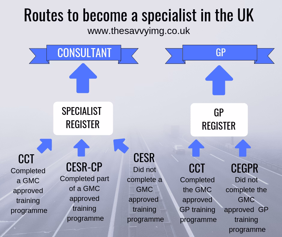 Pe parcursul pregătirii în specialitate, medicii trebuie să treacă o serie de examene riguroase, să completeze un portofoliu de dovezi clinice și să demonstreze competență în domeniul ales. La finalizarea cu succes a pregătirii, medicii obțin Certificatul de Finalizare a Pregătirii (Certificate of Completion of Training – CCT) și se pot înregistra ca specialiști la GMC.