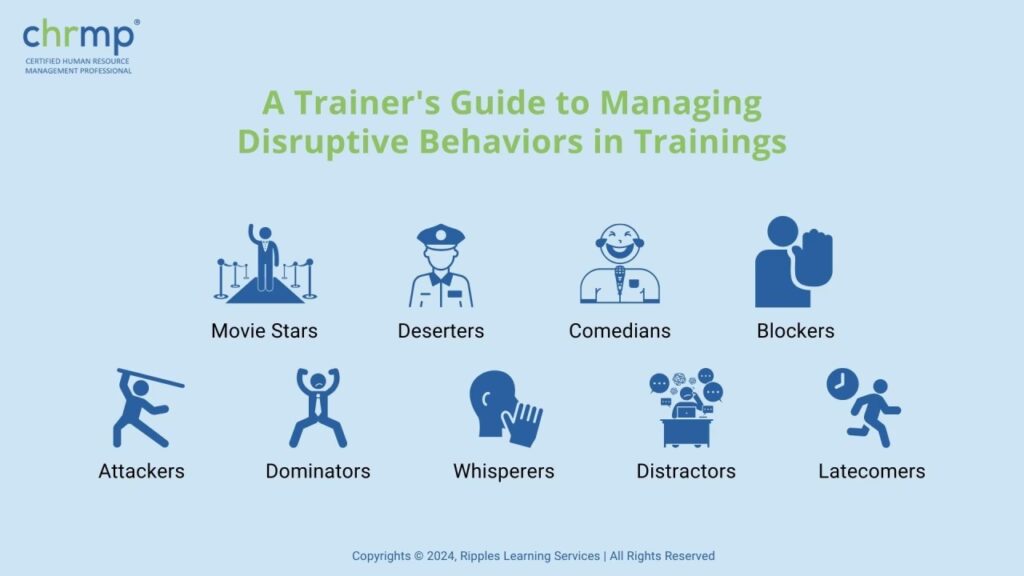 Participanți perturbatori/DistractoriReguli de bază clare, Abordare empatică, Discuție privată, Numirea comportamentului, Cererea ajutorului grupului, Reducerea atențieiMenține focusul pe agendă, Asigură un mediu de respect, De-escaladează conflictele, Responsabilizează grupul