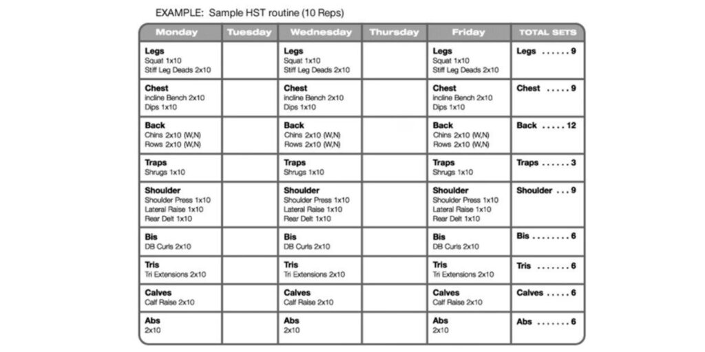 Un program HST tipic antrenează întregul corp de trei ori pe săptămână, cu o zi de pauză între sesiuni (ex: Luni, Miercuri, Vineri). Fiecare sesiune constă dintr-un număr limitat de exerciții (1-2 per grupă musculară mare), efectuate pentru 1-2 seturi de lucru.