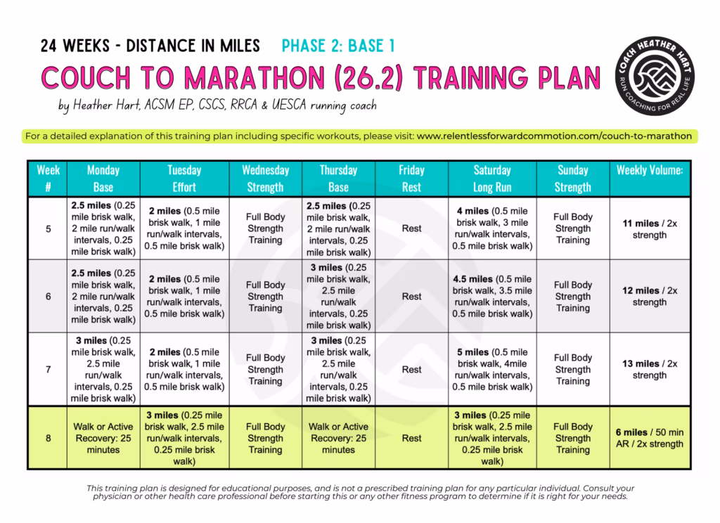 | Săptămâna 2 | Alergare 90s, Mers 2 min (repetați 6x) | Alergare 90s, Mers 2 min (repetați 7x) | Alergare 90s, Mers 2 min (repetați 8x) | ~18-24 min |