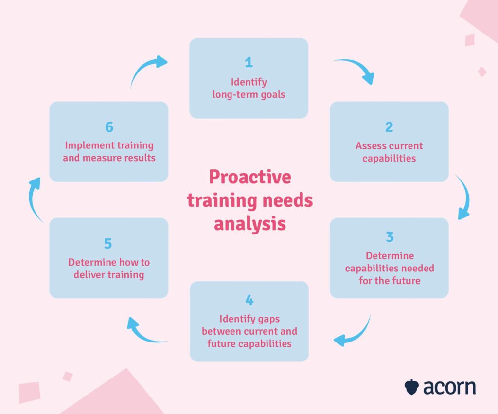 Primul și cel mai important pas este să înțelegeți obiectivele strategice și viziunea pe termen lung a organizației. Indiferent dacă scopul este extinderea pe noi piețe, îmbunătățirea satisfacției clienților, adoptarea de noi tehnologii sau crearea unei linii de succesiune, obiectivele de instruire trebuie să fie o extensie directă a acestor scopuri de afaceri. De exemplu, dacă o organizație vrea să-și intensifice eforturile de marketing digital, instruirea se va concentra pe module avansate de marketing digital și branding. Experții în domeniu utilizează adesea exerciții de „sensing” și workshop-uri vizionare pentru a înțelege misiunea și scopurile organizației, asigurându-se că opțiunile de instruire contribuie cel mai mult la succesul general.