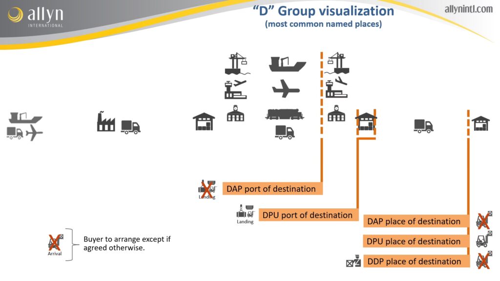 - DPU - Delivered at Place Unloaded (livrat la locul descărcat): Vânzătorul livrează marfa la destinația convenită, descărcată. Această regulă a înlocuit DAT (Delivered at Terminal) din Incoterms® 2010. Riscul se transferă după descărcare.