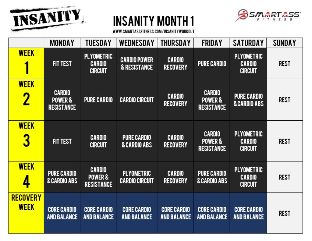 Calendarul de antrenament INSANITY este un program structurat pe 60 de zile, împărțit în două faze principale, fiecare durând patru săptămâni. Este un instrument esențial pe care îl poți folosi pentru a-ți urmări progresul și a rămâne motivat.