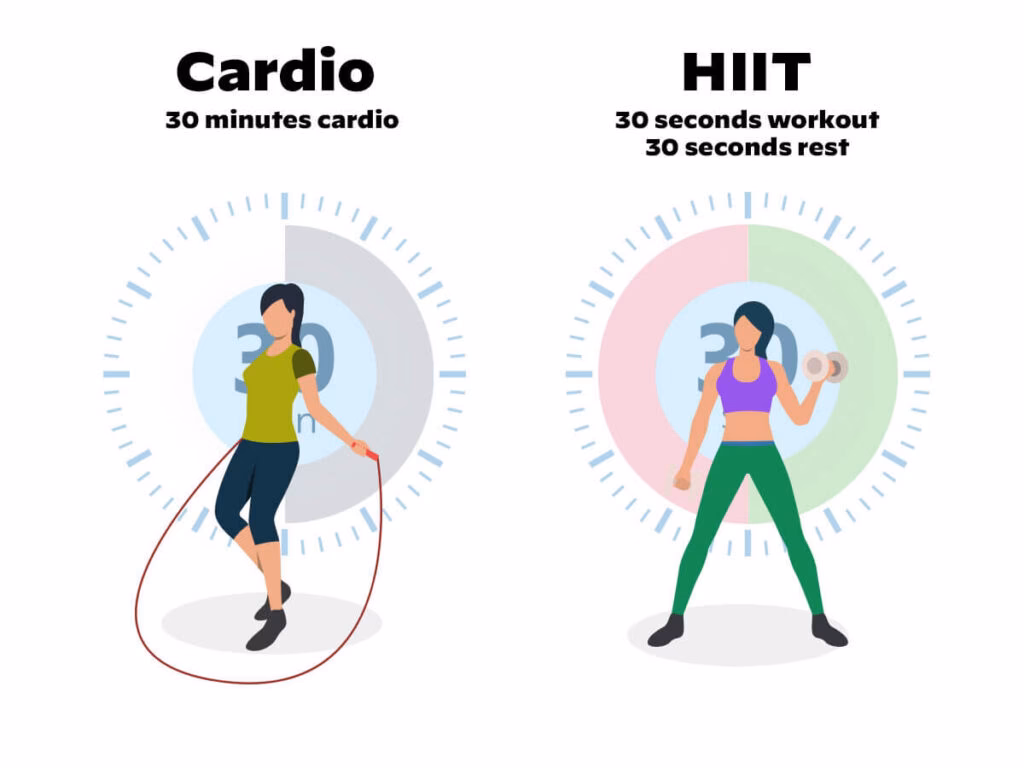 Antrenamentul cardio (sau aerobic), cum ar fi alergatul sau ciclismul, se concentrează pe creșterea ritmului cardiac și pe arderea rapidă a caloriilor în timpul antrenamentului, îmbunătățind rezistența și sănătatea inimii. Antrenamentul de forță, cum ar fi ridicarea de greutăți sau genuflexiunile, se concentrează pe construirea masei musculare. Mușchii ard mai multe calorii în repaus decât grăsimea, crescând rata metabolică de repaus și contribuind la un "post-ardere" mai pronunțat după antrenament. Pe termen lung, antrenamentul de forță este superior pentru un boost metabolic constant, în timp ce cardio oferă o ardere imediată a caloriilor.