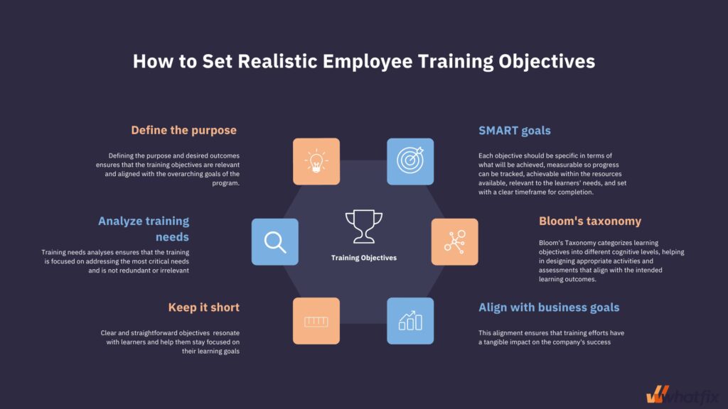 The objectives must articulate what participants are expected to achieve by the end of the training. Defining the purpose and desired outcomes ensures that the training objectives are relevant and aligned with the overarching goals of the program. 2. Analyze training needs Celebrara Micilor Victorii: Pe drumul către obiectivele mari, nu uita să celebrezi și micile succese intermediare. Fie că ai reușit să alergi un kilometru în plus, să faci o repetare în plus la un exercițiu sau să te antrenezi constant timp de o lună, fiecare pas contează. Recunoașterea acestor etape te menține pozitiv și îți consolidează încrederea în capacitatea ta de a-ți atinge scopurile finale.