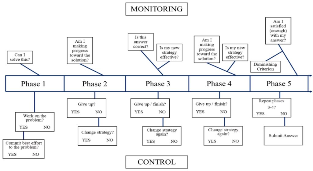 În urma acestei evaluări inițiale, rezolvatorul de probleme perspicace își va reevalua probabil evaluarea inițială pe baza progresului său. De exemplu, în scenariul A, dacă rezolvatorul de probleme finalizează prima problemă de adunare a fracțiilor în 60 de secunde și este conștient metacognitiv că este mult înaintea programului pe care trebuie să-l mențină pentru a finaliza toate problemele la timp, ar trebui să ignore constrângerea de timp ca factor, sau cel puțin să reevalueze la un moment ulterior. Rețineți, totuși, că dacă rezolvatorul de probleme din scenariul B finalizează prima problemă în 60 de secunde, acest lucru ar induce probabil anxietate din cauza faptului că este exact în ritm, cu puțin spațiu de eroare. Astfel, judecățile metacognitive afectează anxietatea matematică atât la începutul, cât și pe parcursul rezolvării problemelor matematice.