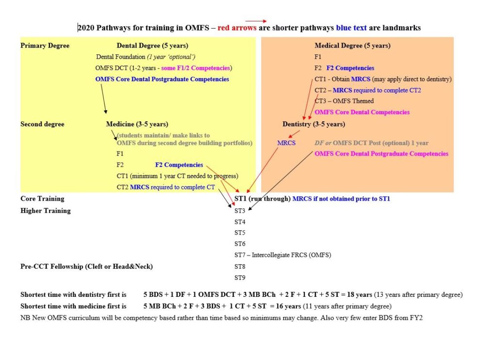 După obținerea celor două diplome universitare, urmează ani de pregătire de bază (foundation years), pregătire chirurgicală de bază (Core Surgical Training - CST) și apoi cinci ani de pregătire de specialitate în chirurgia OMF (ST3-ST7). Întregul parcurs poate dura, în medie, 12-15 ani post-liceu, însă studiile arată că diferența față de alte specialități chirurgicale este mai mică de doi ani până la finalizarea rezidențiatului.
