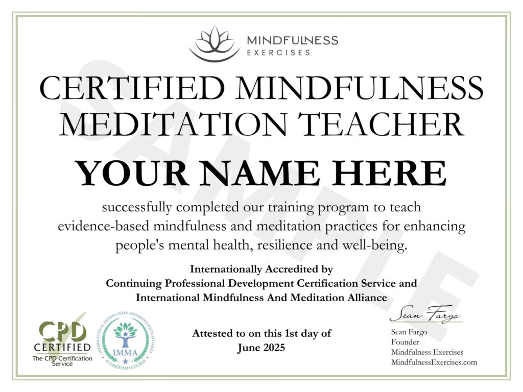 Finalizarea cu succes a tuturor elementelor de pregătire conduce la Certificarea ca instructor MBSR de către Global Mindfulness Collaborative, din care MTTA și Centrul de Mindfulness de la Brown University (MC@B) sunt membri. Această certificare globală asigură un standard înalt de rigor și profesionalism, fiind recunoscută la nivel internațional. Diversele programe de formare pot fi oferite de membri ai echipei în diferite momente și locații, inclusiv online, oferind flexibilitate și accesibilitate. Această structură solidă și bine definită asigură că instructorii certificați posedă nu doar cunoștințele, ci și experiența practică și abilitățile pedagogice necesare pentru a preda mindfulness într-un mod eficient și etic.