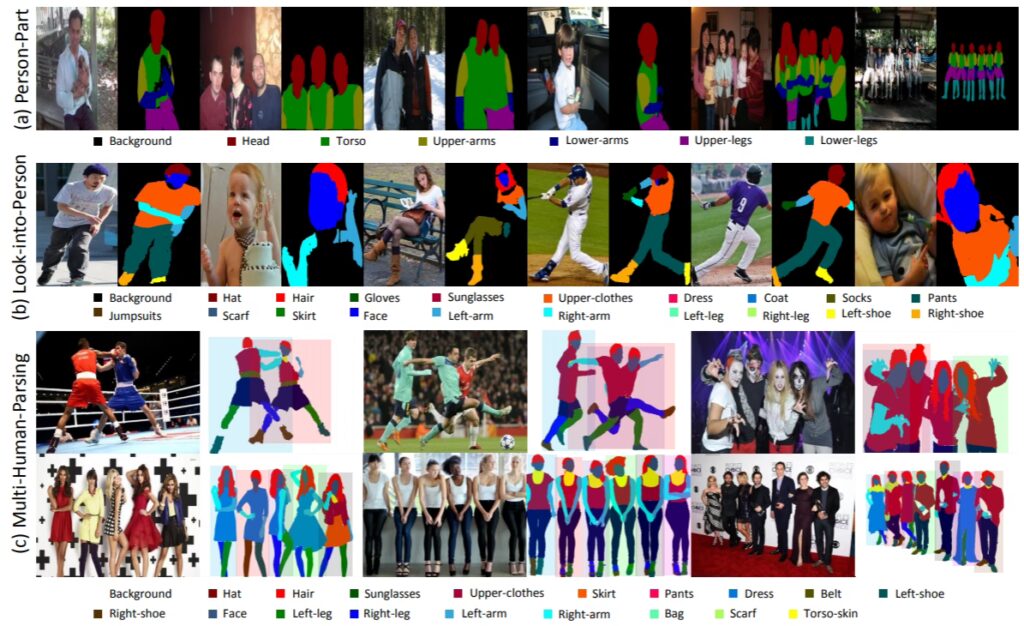 | LIP | Cel mai mare set de date pentru analiză umană cu o singură persoană (peste 50.000 de imagini), axat pe scenarii reale complicate. | 20 | Fundal, Pălărie, Păr, Mănușă, Ochelari de soare, Haine superioare, Rochie, Jachetă, Șosete, Pantaloni, Salopete, Eșarfă, Fustă, Față, Braț stâng, Braț drept, Picior stâng, Picior drept, Pantof stâng, Pantof drept. |