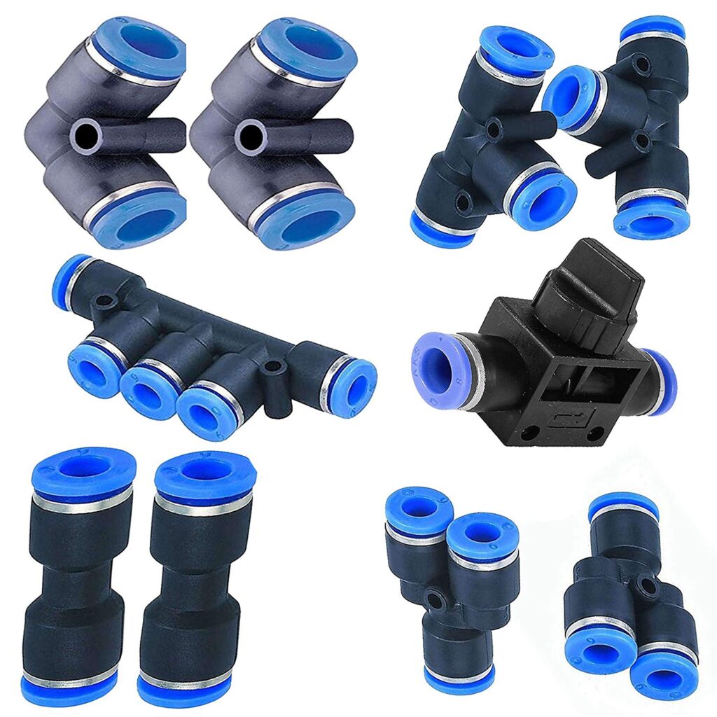 Există o varietate vastă de fitinguri instalate în sistemele pneumatice care acționează în diferite funcții. Cele mai comune tipuri sunt descrise mai jos: