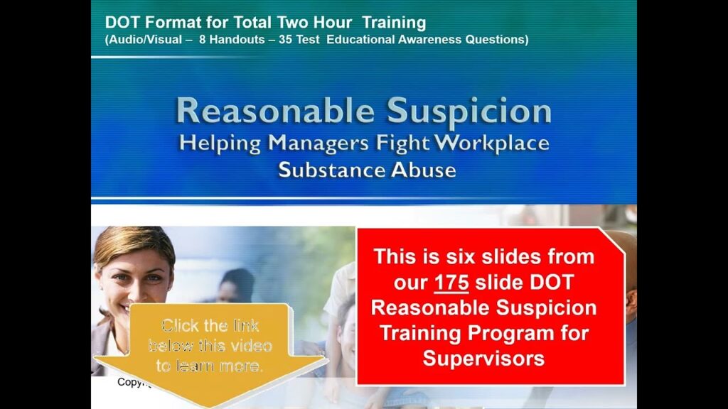 Conform 49 CFR 655.14(b)(2), supervizorii și/sau alți ofițeri ai companiei autorizați de angajator să ia decizii privind suspiciunea rezonabilă trebuie să primească cel puțin 60 de minute de instruire privind indicatorii fizici, comportamentali și de performanță ai utilizării probabile de droguri și cel puțin 60 de minute de instruire privind indicatorii fizici, comportamentali, de vorbire și de performanță ai utilizării probabile de alcool. Videoclipul de instruire al FTA este conceput special pentru a satisface aceste cerințe, oferind o acoperire cuprinzătoare a ambelor aspecte.