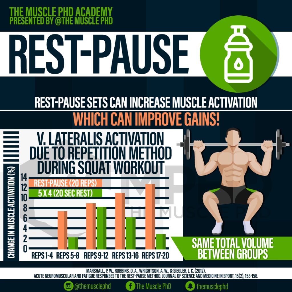 - Poate cel mai convingător, un studiu din 2017, publicat tot în Journal of Strength and Conditioning Research, a comparat un protocol de antrenament rest-pause cu unul de repaus convențional. Grupul convențional a efectuat 3 seturi de 6 repetări la 80% din 1RM cu 2-3 minute de repaus între seturi. Grupul rest-pause a efectuat cât mai multe repetări în primul set, apoi, cu intervale de repaus de 20 de secunde între fiecare sub-set ulterior, au efectuat cât mai multe repetări până la un total de 18 repetări. Cu sarcină și volum egale, nu a existat o diferență semnificativă în câștigurile de forță între cele două grupuri. Diferența majoră? Grupul rest-pause a redus timpul de antrenament, obținând aceleași rezultate.
