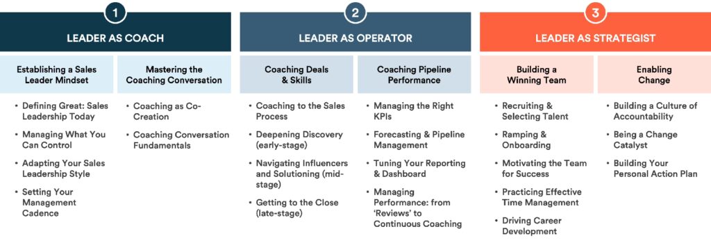 Un program de management strategic al vânzărilor este structurat pentru a acoperi cele mai critice aspecte ale leadershipului modern. Fiecare subiect este o componentă esențială a "planului de antrenament" al liderului de vânzări: