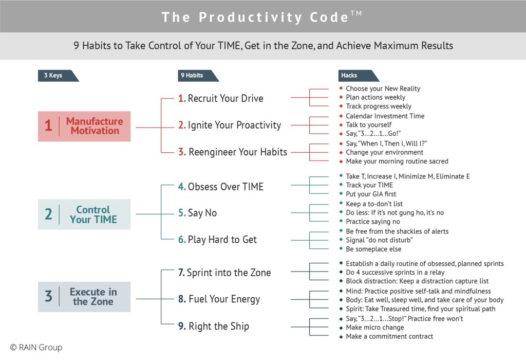 Transformarea comportamentelor și obiceiurilor este cheia maximizării motivației și productivității în vânzări. Cei mai de succes vânzători sunt motivați, proactivi, concentrați și orientați spre obiective. Într-adevăr, cercetările arată că Performerii de Top sunt semnificativ mai predispuși să fie evaluați foarte bine în toate cele nouă domenii majore de productivitate. Ei realizează cele mai multe lucruri și obțin cele mai bune rezultate în mai puțin timp. Prioritizarea eficientă a muncii duce la utilizarea optimă a energiei și timpului și îmbunătățește acțiunea și responsabilitatea. Ignorând distragerile și menținând concentrarea, vânzătorii și managerii de vânzări pot lucra eficient și eficace. Utilizând cele 9 Obiceiuri ale Productivității Extreme, vânzătorii și managerii de vânzări pot adopta obiceiuri și trucuri care le permit să realizeze mai multe în timpul pe care îl au și să obțină creșteri excepționale ale productivității și rezultatelor vânzărilor. Trainingul de productivitate îi va ajuta pe vânzători și managerii de vânzări să-și maximizeze motivația pentru ei înșiși și pentru echipele lor, astfel încât să poată atinge rezultate maxime.