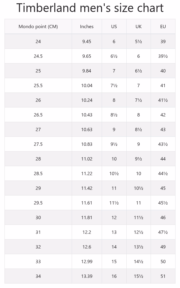 Tabel Mărimi Cizme Timberland pentru Bărbați