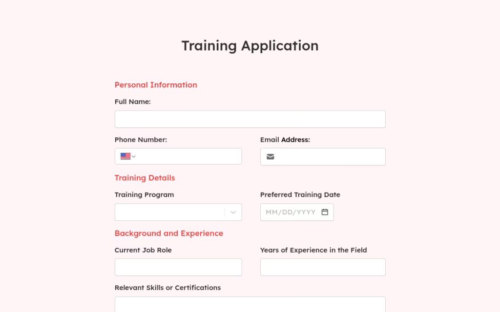 - Formular de Aplicație pentru Antrenament cu Normă Întreagă (Full Time Training Application Form Template): Pentru programe intensive, care necesită dedicare completă.
