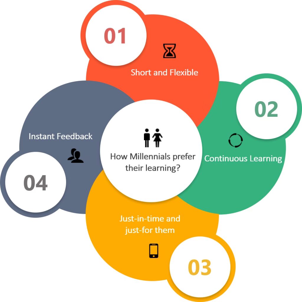 Cu o capacitate de atenție atât de scurtă, milenialii nu pot fi așteptați să consume cursuri eLearning de o oră. Microlearningul este ideal pentru mileniali, deoarece este scurt (nu mai mult de 5 minute), concentrat (abordează un singur obiectiv de învățare per unitate) și antrenant (utilizează o varietate de formate digitale de învățare). Poate fi produs mai rapid, ceea ce îl face perfect pentru instruirea milenialilor, oferindu-le informații "bite-sized" pe care le pot asimila rapid, între întâlniri sau în timpul pauzei de prânz.