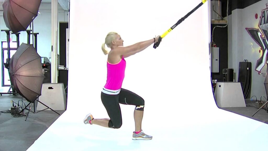 - Poziția de pornire: Stai cu fața la curele, cu o prindere sigură pe mânere. Fă un pas uriaș înapoi cu un picior și coboară în poziția de lunge. Genunchiul din spate ar trebui să aproape să atingă solul, genunchiul din față la o îndoire de 90 de grade, iar brațele drepte.
