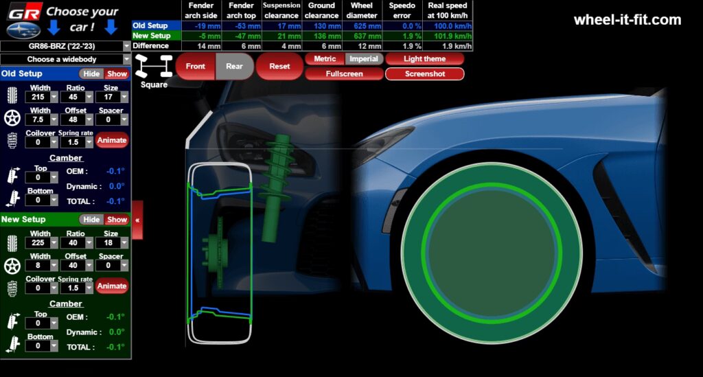 Un offset incorect poate cauza probleme grave de clearance (frecarea anvelopei de aripă sau de componentele interne), uzură neuniformă a anvelopelor și probleme de manevrabilitate. În cazuri extreme, poate chiar duce la defectarea suspensiei. Întotdeauna verificați cu atenție rezultatele. - Pot compara două configurații diferite?
