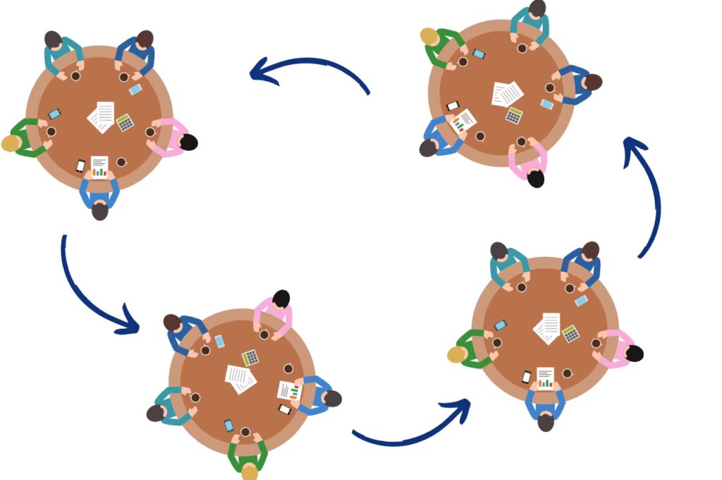 - Conectarea Ideilor: Prin mișcarea între mese, participanții poartă cu ei idei cheie și teme de la o conversație la alta, țesând un fir continuu de perspective și construind conexiuni între diverse puncte de vedere.
